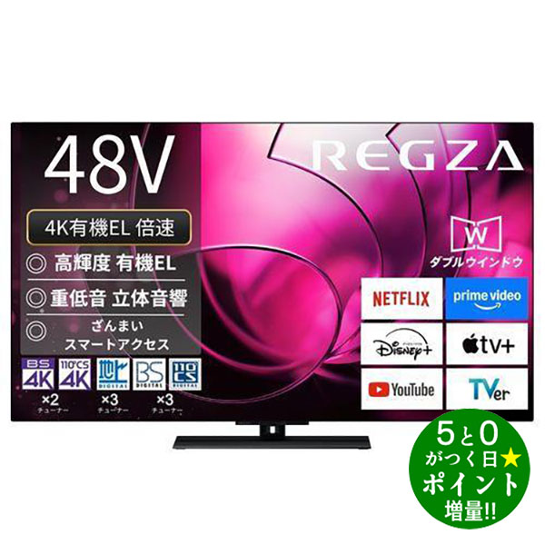 【返品OK!条件付】TVS REGZA 48V型 有機EL レグザ X8シリーズ X8900R 4K有機EL 48X8900R ハイグレードモデル 外付けHDD録画対応 48インチ【KK9N0D18P】【安心の30日以内返品OK!条件付】※代引き支払不可◎テレビ用アンテナケーブル(別売り)はこちらからご購入頂けます。 ≫◎HDMIケーブル(別売り)はこちらからご購入頂けます。 ≫■スマートでリッチな臨場感ハイグレード有機EL■仕様・パネル方式:4K有機ELパネル・画素数(水平×垂直):3840×2160 [4Kパネル]・画面寸法:幅 105.2cm,高さ 59.2cm,対角 120.7cm・外形寸法(スタンド付き):幅 106.9cm,高さ (低)66.0cm/(高)69.0cm,奥行 26.5cm・質量(スタンド含む/本体のみ):20.5kg/16.4kg・梱包箱寸法:幅 123.0cm,高さ 79.5cm,奥行 19.0cm・梱包時質量:26.0kg■消費電力・消費電力:246W (電源『待機』時 0.4W、機能動作時 18W)・年間消費電力量 ※1:143kWh/年・省エネ基準達成率 ※2:81% (2026年度基準)■チューナー・4K衛星放送 ※3:2・地上デジタル:3・BS・110度CSデジタル:3■高画質・映像処理エンジン:レグザエンジンZRα・超解像技術:AI超解像/AIナチュラル フォーカス テクノロジーPRO(AI構図推定)・美肌高画質:ナチュラルフェイストーンPRO・AI高画質:AIシーン高画質PRO (ネット動画・地デジ放送・HDMI入力映像)・ネット動画高画質:ネット動画ビューティPRO/ネット動画バンディングスムーサーPRO(地デジ放送・HDMI入力映像にも対応)/AIコンテンツ判別・アニメ高画質:アニメビューティPRO・地デジ高画質:地デジAIビューティPRO・自動映像調整機能:おまかせAIピクチャーPRO・ブルーライト制御:●・パネル:新開発 高コントラス有機EL・低反射:低反射パネル・広色域復元:3次元カラーリマスター・カラーイメージコントロール:36色軸リッチカラーイメージコントロール・倍速対応:●120Hz倍速・HDR高画質:HDRオプティマイザー/HDR復元/HDRリアライザー・HDR信号対応:・HDR10/・HLG HDR/・Dolby Vision/・HDR10+ (HDR 10+フォーマット対応)・HDR対応:●・クラウドAI高画質テクノロジー:●・プロユース映像設定機能:●・クラウドAI高画質連携:●■高音質・サウンドシステム/イコライザー:重低音立体音響システムX・Dolby Atmos:●・オーディオキャリブレーション:●・クリア音声:●・おまかせAIサウンド ※4:●・Bluetooth対応:●・レグザサウンドプロセスVIR:●・レグザサウンドリマスター:●・VIRイコライザー:●・高遮断クロスオーバーフィルター:●・音声実用最大出力(JEITA):合計 60W(同時駆動)/・2wayメインスピーカー (9W+9W+9W+9W+9W+9W)/・トップスピーカー(3W+3W)・スピーカー(個数):・2wayメインスピーカー (フルレンジ 4個、ツィーター 2個)/・トップスピーカー(2個)/合計 8個■ネット動画・ネット連携■タイムシフトマシン・タイムシフトマシン [過去番組表] ※13:タイムシフトリンク●・始めにジャンプ ※13:タイムシフトリンク●■かんたん録画・USBハードディスク録画■端子・HDMI?入力端子:4(eARC/ARC ※16 )・HDMI?4K入力対応(18Gbps以下):3840×2160:60p/30p/24p・HDMI?2.1規格対応機能:4K120p ※17、VRR ※17、eARC ※16、ALLM・光デジタル音声出力端子:1・LAN端子[10BASE-T/100BASE-TX]:1・USB端子(通常録画専用):1(USB3.0、定格出力:DC 5V 900mA MAX)・USB端子(AV周辺機器専用):1(USB2.0、定格出力:DC 5V 900mA MAX)・ヘッドホン端子:1■付属品・単四形乾電池:●(2本)・レグザリモコン:●(CT-90507)・転倒防止バンド等:転倒防止用バンド 1本、転倒防止用ネジ(短) 1本・ネジ(長) 1本※ 本機は従来のB-CASカードに代わりACAS方式を採用していますのでB-CASカードの挿入口はありません。また、B-CASカードは付属しておりません。※ 本商品は、株式会社モリサワのフォント「UD新ゴR」、「UD新丸ゴR」、「UD新丸ゴB」を搭載しています。「UD新ゴR」、「UD新丸ゴR」、「UD新丸ゴB」は株式会社モリサワの商標であり、フォントデータの著作権は株式会社モリサワに帰属します。*1)「年間消費電力量」とは、省エネ法に基づいて、1日あたり5.1時間の平均視聴時間/18.9時間の待機時間(電子番組表取得時間を含む)で算出した、一年間に消費する電力量です。*2)「省エネ性マーク」は省エネ性能を表しており、省エネ基準達成製品は緑色、未達成製品は黄赤色になります。商品をお選びになる際のご参考にしてください。「達成率」は、省エネ法に定められた2026 年度基準に対する省エネルギー基準達成率を示すものです。*3) 8K放送の受信には対応していません。*4) 接続するBluetooth機器の操作方法については、ご使用になるBluetooth機器の取扱説明書をご覧ください。*5) 本機能のご利用にはインターネットへの接続が必要です。*6) 接続する機器によっては表示できない場合があります。*7) 本機能のご利用には、ホームネットワーク(LAN)を構築し、設定のうえ対応機器を接続する必要があります。*8) 本機能は、別売のタイムシフトマシン対応USBハードディスクへの録画や別売のUSBハードディスクへの通常録画、またはタイムシフトリンクで接続した別売のレグザタイムシフトマシン対応レコーダーや別売のタイムシフトマシン対応レグザに録画した番組が対象です。*9)機能によっ